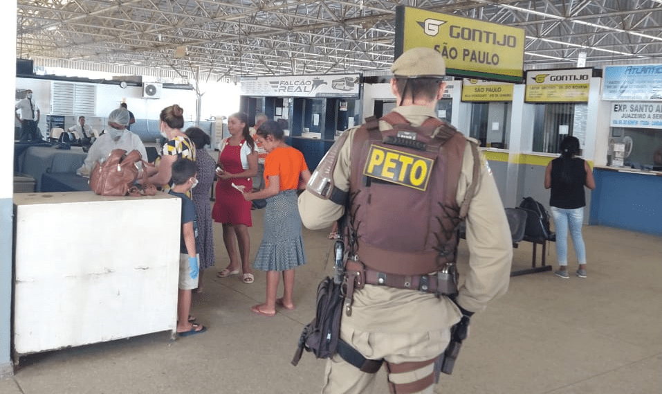 Durante ação preventiva na Rodoviária de Juazeiro (BA), ontem (24), equipes da Vigilância Epidemiológica da prefeitura, em parceria com a 75ª Companhia Independente da Polícia Militar (CIPM), abordou passageiros que desembarcavam no local. A medida teve como finalidade realizar a avaliação das pessoas, checar seus quadros clínicos de saúde e orientá-las para o isolamento domiciliar.