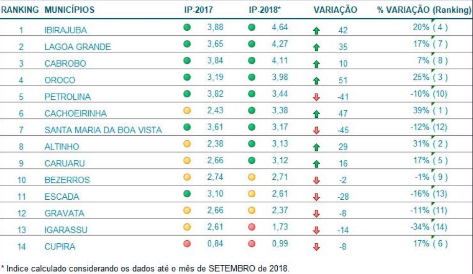 Nesta segunda classificação, o município de Ibirajuba se manteve no primeiro lugar em relação à primeira, seguido de Lagoa Grande, que também preservou a posição. Já Orocó caiu do terceiro para o quarto lugar e foi substituído por Cabrobó. Cachoeirinha alcançou o quinto lugar e, assim, Petrolina desceu para a sexta colocação. Altinho e Caruaru trocaram de lugar, com a Capital do Forró descendo de oitavo para nono (ver a tabela completa aqui).
