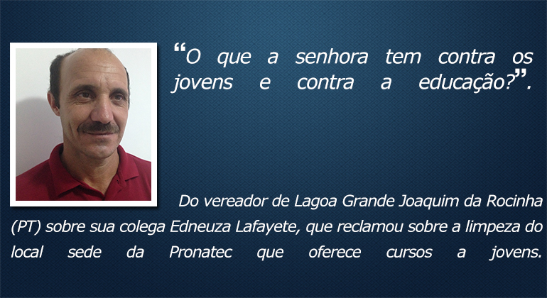 Joaquim da Rocinha o que a senhora Edneuza quer dizer para o senhor e os Pais dos alunos, que irá frequentar aquela instituição seja digna de um ser Humano, nós não estamos mais no tempo das CAVERNAS, veja o que o Planalto faz em suas viagens, ficam nos melhores HOTElI do mundo, não seja tolo de comprar briga de corruptos o governo federal esta falido sem moral.