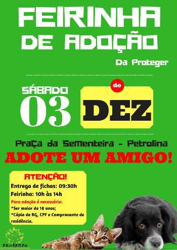 Organização Não Governamental (ONG) que atua em defesa dos animais de rua, A Associação Proteger prepara-se para realizar mais uma Feirinha de Adoção. O evento acontecerá neste sábado (3/12), na praça da Academia das Cidades (antiga Praça da Sementeira), a partir das 9h30, quando começarão a ser entregues as fichas aos interessados em adotar um animalzinho.
