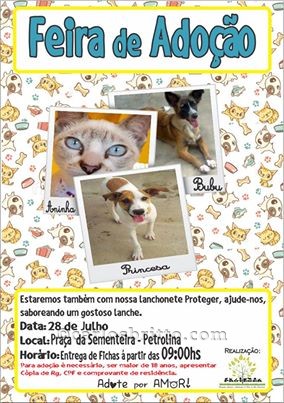 feirinha dia 28 de julhoA ONG Proteger realizará no próximo dia 28, em Petrolina, mais uma feirinha de adoção de animais. O evento acontecerá na Praça da Sementeira, Avenida da Integração, a partir das 9h.