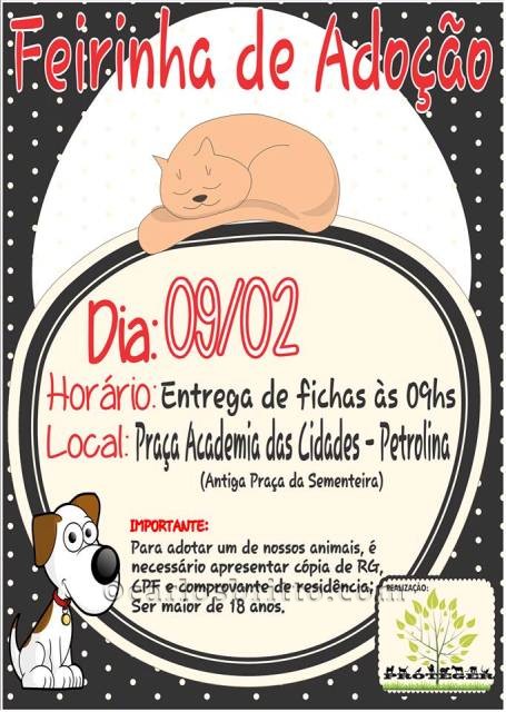 Quem tiver interesse em criar um animal de estimação poderá adotar um gato ou cachorro em mais uma feirinha de adoção realizada pela ONG Proteger. O evento será neste domingo (9), a partir das 9h, na Academia das Cidades, no bairro Quilômetro 2, em Petrolina.