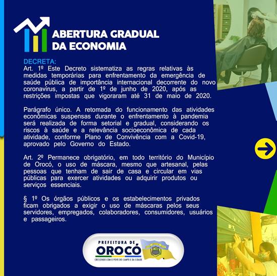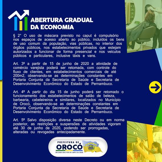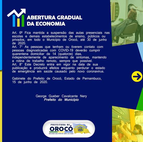 Em Orocó (PE), Sertão do São Francisco, o prefeito de George iniciou ontem (17), por meio do Decreto nº 034/2020 (abaixo) a reabertura gradual de algumas atividades econômicas do município, seguindo as recomendações do governo do Estado. Atividades como salões de beleza e estética, comércio varejista, lojas de até 200 metros quadrados, estão liberados, seguindo as orientações de higiene, como o uso de máscara, distanciamento entre as pessoas e a higienização do espaço.