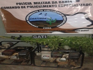 As equipes ainda apreenderam dois motores-bombas que serviam para conduzir a água do Rio São Francisco para irrigar a plantação. Nenhum responsável pela roça foi encontrado. Os equipamentos e algumas amostras da maconha foram entregues à Delegacia de Polícia Civil (DPC) local, que vai investigar o caso. (foto: 2ª CIPM/divulgação)