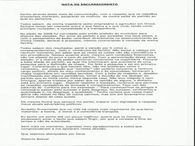 Nos motivos que esclarece nesta nota enviada ao Blog (foto), Bolivar justifica ter sido “apunhalado” pelas costas por integrantes do partido que considerava “sua segunda casa”.