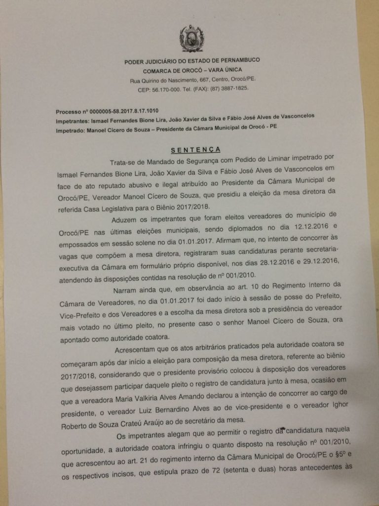Em Orocó (PE), Sertão do São Fancisco, a justiça acatou um mandado de segurança impetrado pelos vereadores Ismael Lira, João de Demar e Binho de Seu Tonho determinando a anulação da eleição da Mesa Diretora, ocorrida no final de dezembro passado.