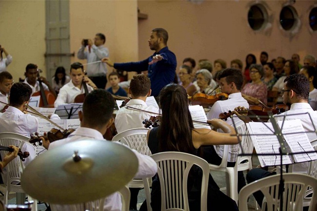 Realizando a sua primeira turnê nacional, a Orquestra já acumula experiência fora do Brasil. Em outubro do ano passado, promoveu uma série de apresentações durante a 16ª Conferência Internacional da Fraternidade Católica, na Itália, incluindo um concerto privado para o Papa Francisco na Sala Paulo VI, no Vaticano. Ainda na Europa, o grupo apresentou-se, em novembro, para o primeiro-ministro de Portugal, Pedro Passos Coelho. (foto: Clayton Barros/divulgação)