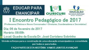 A Prefeitura de Ouricuri, no Sertão do Araripe, realizará o 1º Encontro Pedagógico de 2017 ‘Educar para emancipar’. O evento será realizado na próxima segunda-feira (6), na quadra poliesportiva da Escola Municipal Dr. José Coriolano Sobrinho, às 8h, com a presença da equipe da administração municipal, além de um representante do Sindicato dos Servidores Públicos de Ouricuri (Sindsep). O público principal serão os professores efetivos e os novos concursados.