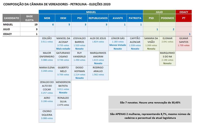 As eleições 2020 pouco mudarão a conjuntura política em Petrolina a partir do ano que vem. O prefeito Miguel Coelho foi reeleito e continuará com ampla maioria na Câmara de Vereadores. A única diferença, agora, é a composição de forças na Casa Plínio Amorim. Tanto o partido de Miguel, o MDB, quanto o DEM, formarão as maiores bancadas – o primeiro elegeu 6 vereadores, o segundo 5. Mas além dessas duas legendas, o PSC (com 3 vereadores), o Republicanos (também com 3), o Avante e o Patriota (ambos com um cada) darão sustentação ao prefeito reeleito. O ex-prefeito Julio Lossio e seu grupo continuarão na oposição com o PSD (partido de Julio), que elegeu uma vereadora, e o Podemos (com […]