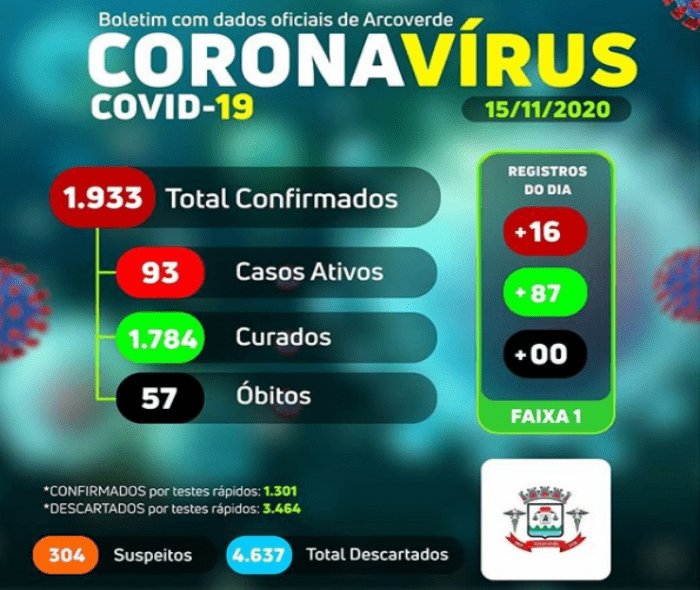 A Secretaria de Saúde de Arcoverde (PE), Sertão Moxotó, informou que neste domingo (15) foram registrados no município 16 casos positivos do novo coronavírus (Covid-19) e 87 curas clínicas. Portanto, o boletim fica com 304 casos suspeitos, 4.637 descartados, 1.933 confirmados, 57 óbitos e 1.784 recuperados da doença. Internamentos No total, Arcoverde tem sete pacientes na UTI e sete internados em enfermaria. A taxa de recuperação dos casos confirmados é de 74,25%, enquanto a de letalidade está em 3,52%.