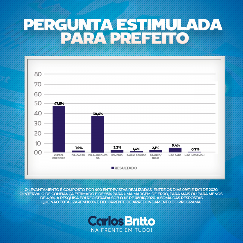 Em mais um levantamento feito pelo instituto DataQualyt, os dados mostram que o eleitorado de Salgueiro (PE), Sertão Central, pode decidir conduzir Clebel Cordeiro (PL) à prefeitura da cidade mais uma vez. O levantamento feito entre os dias 9/11 e 12/11 de 2020, ouviu 400 pessoas e aponta o atual prefeito na dianteira com 47,5% das intenções de votos. O intervalo de confiança estimado é de 95% e a margem de erro, para mais ou para menos, é de 4,9%. A pesquisa foi registrada sob o n° PE 08010/2020. A soma das respostas que não totalizarem 100% é decorrente de arredondamento do programa. A íntegra da pesquisa pode ser acessada pelo link disponibilizado no Blog. https://drive.google.com/drive/mobile/folders/1SzB7PRcu7iCpd36Ovt3ZBRWM1kpSlt58/1lEpyIxuupVqNXZ7QIKVWbJJDZiObk646?usp=sharing&sort=13&direction=a