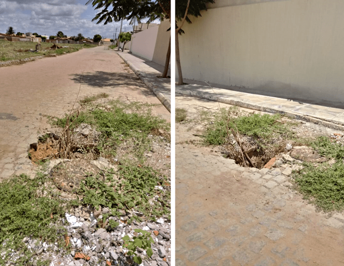 No Bairro Padre Cícero, zona norte de Petrolina, um buraco ‘camuflado’ oferece risco para motoristas e pedestres que circulam pelo local, na Rua 11. Através do WhatsApp do Blog, os moradores dizem que o problema já dura quatro meses e até agora nada foi feito. O buraco fica ao lado de uma boa de lobo e, ao redor, o mato começou a invadir o local, camuflando a abertura no calçamento. Um perigo.