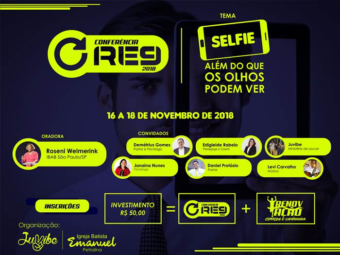 A Igreja Batista Emanuel de Petrolina promoverá, de 16 a 18 de novembro, a Conferência ‘RE9’ edição 2018, que terá como tema central “Selfie, além do que os olhos podem ver!”. O evento tem por objetivo tratar da convicção de uma identidade de autoaceitação com saúde emocional e espiritual, A oradora principal será Roseni Welmerink, do Ibap/SP, que discutirá a temática voltada para “tempo de intenso desafio para lidar com depressão, ansiedade, baixa autoestima, desânimo, estresse, conflitos, traumas, vícios, entre outros”. Segundo os organizadores, a autoimagem é um fator determinante na forma de se enfrentar esses desafios. Entre os participantes confirmados no evento estão os pastores Demétrius Gomes e Daniel Protássio; a psicóloga Janaína Nunes; a pedagoga e coach Edigleide […]