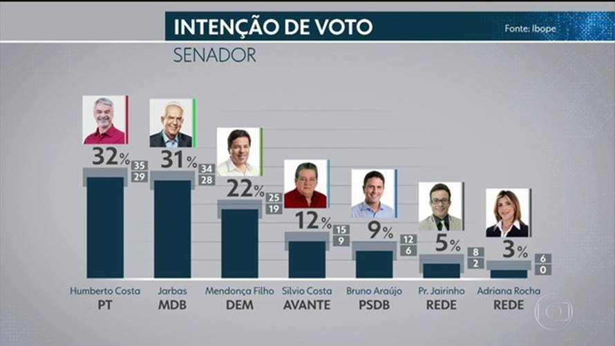 Pesquisa Ibope divulgada nesta quinta-feira (27) aponta os seguintes percentuais de intenções de voto para o Senado em Pernambuco: Humberto Costa (PT): 32% Jarbas (MDB): 31% Mendonça Filho (DEM): 22% Silvio Costa (Avante): 12% Bruno Araújo (PSDB): 9% Pastor Jairinho (Rede): 5% Adriana Rocha (Rede): 3% Eugênia (PSOL): 2% Hélio Cabral (PSTU): 2% Albanise Pires (PSOL): 2% Lídia Brunes (Pros): 1% Alex Rola (PCO): 1% Brancos/nulos – Vaga 1: 20% Brancos/nulos – Vaga 2: 29% Não sabe/não respondeu: 30% A pesquisa foi encomendada pela TV Globo e pelo Jornal do Commercio. É o quarto levantamento do Ibope realizado depois da oficialização das candidaturas na Justiça Eleitoral. No levantamento anterior, feito entre os dias 14 e 16 de setembro, os percentuais […]