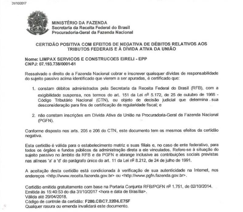 Por meio de nota, a empresa Limpax Serviços e Construções Eireli, que venceu a licitação do setor de limpeza pública de Salgueiro (PE), no Sertão Central, rebateu a informação divulgada ontem (3) neste Blog de que estaria com a certidão negativada, e mesmo assim a prefeitura a teria contratado. “A Limpax assinou Contrato e Ordem de Serviço para iniciar os trabalhos na próxima quarta-feira, dia 8 de novembro de 2017, após vencer todas as etapas do processo em conformidade com as exigências da legislação vigente no país”, declarou. “Acerca de publicação nesta data em um blog e eventuais reproduções noutros meios de comunicação, de que a Limpax teria participado do certame com Certidão Negativa de Débito vencida, não procede, esclarecendo […]