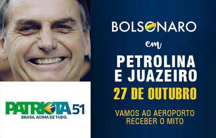 Circula nas redes sociais um boato sobre a suposta vinda do deputado federal presidenciável Jair Bolsonaro (PSC) a Petrolina (PE) e Juazeiro (BA), depois de serem colocados outdoors de Bolsonaro em Salgueiro (PE), no Sertão Central, e Sobradinho, no norte da Bahia, conforme foi mostrado por este Blog. O banner divulgado nas redes sociais diz que o deputado federal e presidenciável desembarcará no Aeroporto Internacional Senador Nilo Coelho, em Petrolina, nesta sexta-feira (27). Também no cartaz é feita uma convocação para os simpatizantes do militar da reserva o receberem no aeroporto. “O deputado Jair Bolsonaro não virá a região de Petrolina e Juazeiro no dia 27/10, como estão divulgando no WhatsApp. No momento oportuno, será divulgada de forma fidedigna a […]