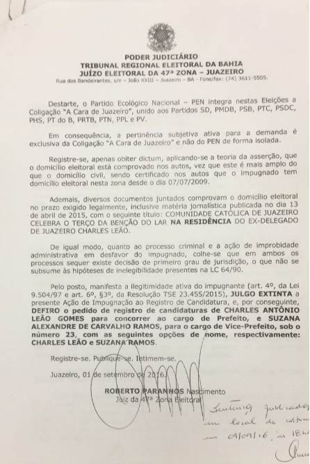 A candidatura de Charles Leão (PPS) a prefeito de Juazeiro (BA) foi deferida ontem (1) pela Justiça Eleitoral. A candidata a vice, Suzana Ramos (PSDB) também teve seu registro deferido (veja aqui). Em nota, a coligação ‘Juazeiro de Coração’, da qual Leão e Suzana fazem parte, afirma que “sem justo motivo, e numa tentativa de criar um fato político, o Partido Ecológico Nacional (PEN) ajuizou ação de impugnação de registro de candidatura em desfavor de Charles Leão, alegando que o candidato não possui domicílio eleitoral nesta cidade e que possuía processo criminal.“ A nota diz que “a defesa apresentou contestação, averbando que Charles Leão possui domicílio eleitoral em Juazeiro desde o ano de 2009, e provou a inexistência de processo de […]