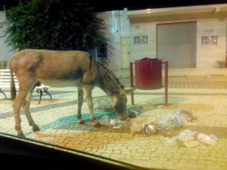A foto acima, por mais inacreditável que pareça, foi feita por um leitor do Blog em pleno Centro de Mirandiba (PE), Sertão Central. Com o lixo espalhado pela calçada, o jumento aproveita tentar encontrar algum resto de comida. O problema é que nem o lixo, e muito menos o animal, deveriam estar ali. É falta de fiscalização? Com a palavra, as autoridades.