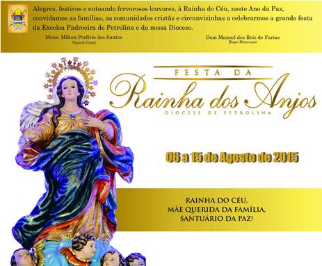 A comunidade católica de Petrolina já vive os preparativos para o Novenário em homenagem à padroeira da cidade, Nossa Senhora Rainha dos Anjos, que começará no dia 6 de agosto e se encerrará no dia 15, quando ocorrerá a grande festa em homenagem à padroeira. As novenas seguirão até o dia 14. Já no dia 15, data da celebração da Rainha dos Anjos, haverá procissão pelas ruas de Petrolina seguida por uma grande missa na Praça Dom Malan, ao lado da Catedral do Sagrado Coração de Jesus. A programação completa pode ser conferida acessando aqui. (foto/divulgação)