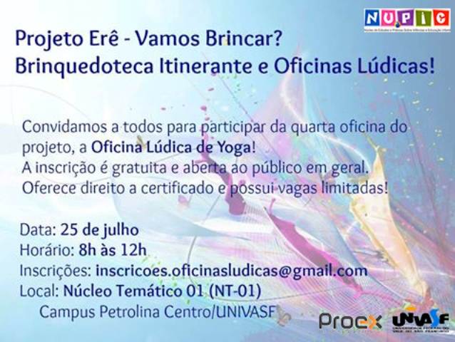 Prosseguem abertas na Universidade Federal do Vale do São Francisco (Univasf)/Campus Sede, em Petrolina, as inscrições para a Oficina Lúdica de Yoga, que acontecerá neste sábado (25), das 8h às 12h. A atividade será realizada pelo Núcleo de Estudos e Políticas sobre Infância e Educação Infantil (Nupie). Crianças e adultos podem participar da ação. As vagas são limitadas, por isso é necessário fazer a inscrição prévia pelo e-mail inscricoes.oficinasludicas@gmail.com. Esta é a quarta oficina do projeto “Erê – Vamos Brincar? – Brinquedoteca Itinerante e Oficinas Lúdicas”, cujo nome ‘Erê’ é originário de uma entidade da cultura e religião afro-brasileiras e representa um estado de espirito lúdico e brincalhão, muito particular das crianças. O projeto, coordenado pelo professor do Colegiado de […]