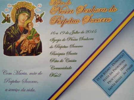 A comunidade católica do bairro Quilômetro 2, em Petrolina, vai celebrar de quinta-feira (16) até sábado a festa em homenagem à padroeira Nossa Senhora do Perpétuo Socorro. A programação contará com a procissão e a Santa Missa, além de quermesse e shows religiosos. Confiram, abaixo, a programação completa da festa: Programação Geral – Dias 16, 17 e 18 de julho de 2015 19h30 – Tríduo Festivo e Santa Missa Quermesse Doce amor de Maria 1ª Noite – 16/07 Celebrante: Padre Pedro Jordão Animação: Coral de Jovens São Judas Tadeu 2ª Noite – 17/07 Celebrante: Padre Rogério Animação: Coral Grupo Seguidores de Cristo 3ª Noite – 18/07 Celebrante: Padre Francisco Augusto Santana de Macêdo Animação: Coral Comunidade Boa Nova Atração: 4 […]