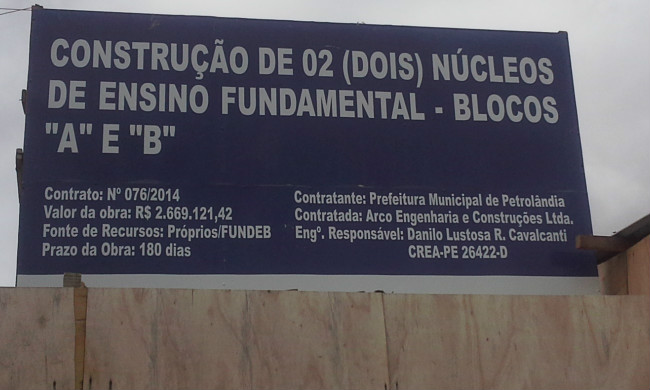 O comunitário Aluízio Gomes de Carvalho esbanja ironia ao comentar sobre a atual administração municipal de Petrolândia (PE), no Sertão de Itaparica. Ele critica, entre outras coisas, as obras anunciadas pela gestão, as quais caminham “a passos de tartaruga”. Confiram: Estamos de parabéns! vejam mais uma obra em nosso município, a construção de dois núcleos de ensino fundamental que estão sendo construídos na quadra 11, mais precisamente dentro do terreno onde seria o Ceasa. Essa construção está a todo vapor, teve início em dezembro de 2014 e até agora só conseguiram levantar as paredes. O prazo da obra é de 180 dias, isto está na placa. Devemos salientar que esse prazo já foi ultrapassado. O município tem pressa nessa obra, […]