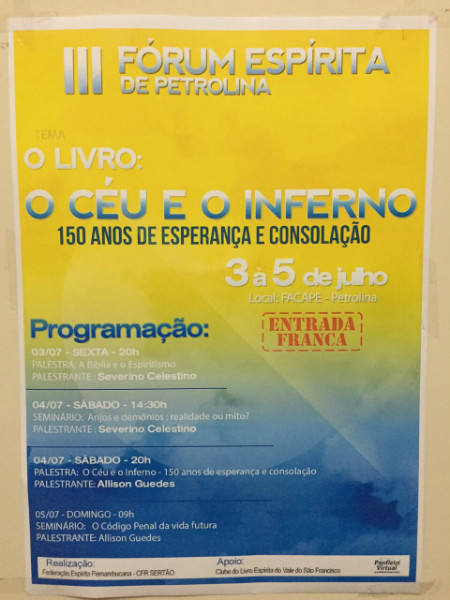 Petrolina realizará na próxima semana (de 3 a 5 de julho) o 3° Fórum Espírita, que tratará debaterá o livro “o Céu e o Inferno: 150 anos de Esperança e Consolação”. O evento, que acontecerá na Facape, é aberto ao público e será composto de palestras começando na sexta-feira (3/07), às 20h, sobre a Bíblia e o Espiritismo, cujo palestrante será Severino Celestino. É ele também quem falará ao público no sábado (4/07), sobre “Anjos e Demônios: Realidade ou Mito?”. A palestra acontecerá às 14h30. Também no sábado, às 20h, é a vez do palestrante Allison Guedes proferir sobre o tema central do 3° Fórum. Encerrando o evento, Allison também falará no domingo (5/07), às 9h, sobre “O Código Penal […]