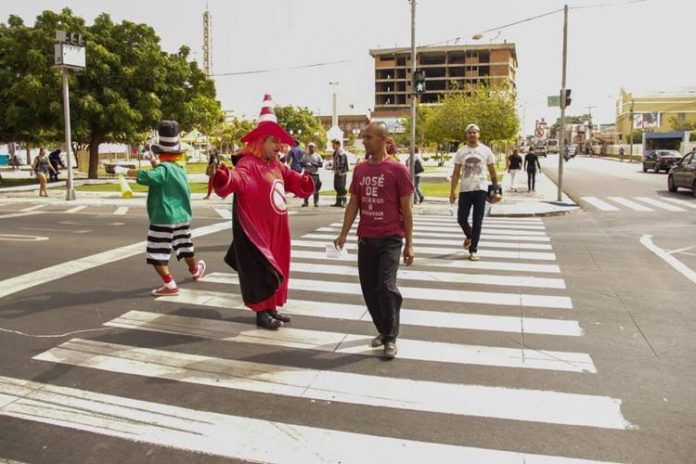 Na manhã desta quinta-feira (9), as atividades foram concentradas na Avenida Guararapes, Centro da cidade, onde os pedestres receberam orientações divertidas para atravessar a rua usando a faixa.