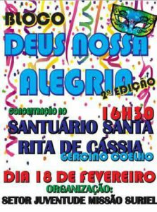 Com a proximidade do Carnaval, a comunidade católica da Paróquia Santa Rita de Cássia, em Petrolina, já começa a vivenciar os preparativos para a 2ª edição do Bloco ‘#DeusNossaAlegria’, que acontecerá neste sábado (18). A saída será às 16h30, do Santuário Santa Rita de Cássia, localizado à Rua Carretão, no Bairro Gercino Coelho, finalizando no Cemam (Centro Maria Auxiliadora), no mesmo bairro.