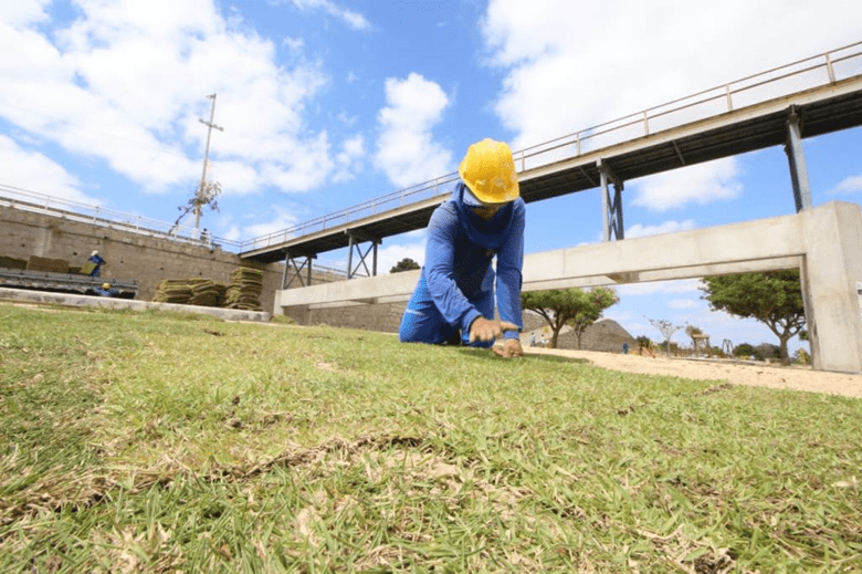 A Secretaria de Obras e Desenvolvimento Urbano (Sedur) de Juazeiro (BA) iniciou nesta quarta-feira (13) mais uma etapa de serviços na obra de construção do Parque Fluvial. O local já começou a receber o paisagismo, com plantio de mudas, placas de grama e sistema de bombeamento para a irrigação nos jardins.