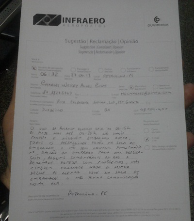 Um leitor enviou ao Blog o registro na Ouvidoria da Infraero (foto) de um fato ocorrido na manhã desta quarta-feira (27), com uma das companhias que operam no Aeroporto Internacional Senador Nilo Coelho. Segundo ele, os passageiros ficaram numa “situação constrangedora”.