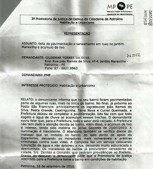 Cansado de esperar pela pavimentação de algumas ruas do bairro Jardim Maravilha, zona oeste de Petrolina, o líder comunitário Gildemar Torres da Silva decidiu buscar a solução para o problema na justiça. “Dei entrada no Ministério Público para que interceda junto a prefeitura para o calçamento de várias ruas do bairro, já que são muitos anos de sofrimento com lama, poeira, esgoto e lixo”, disse.