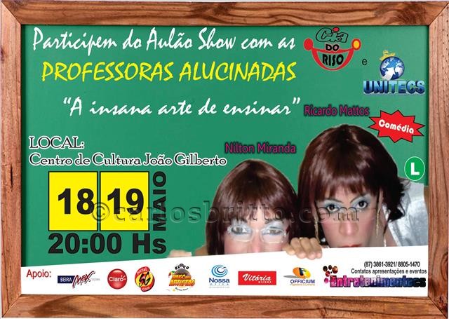 As ‘professoras’ são interpretadas pelos atores Nilton Miranda e Ricardo Mattos, da Cia do Riso. A peça estará em cartaz no sábado (18) e no domingo (19), às 20h, no Centro de Cultura João Gilberto, em Juazeiro. Os ingressos custam R$ 20 (inteira) e R$ 10 (meia entrada).
