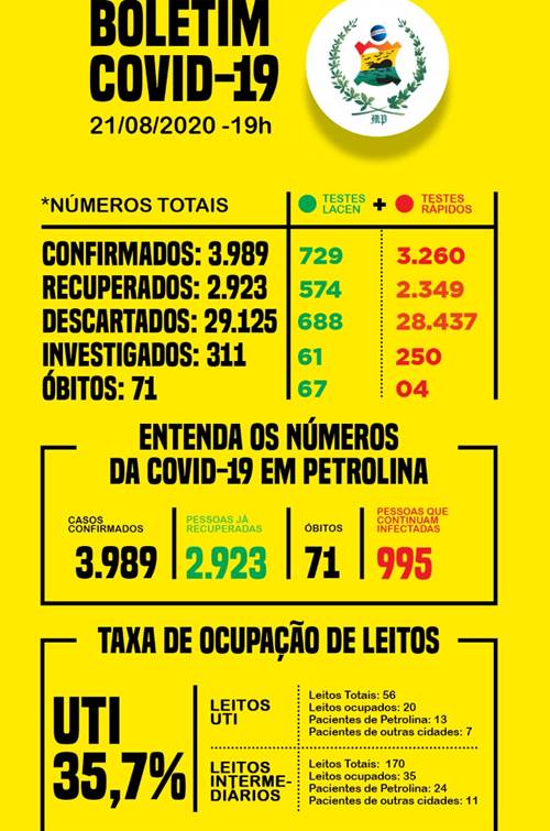 Do total de confirmados até o momento, 3.260 foram por testes rápidos da prefeitura e 729 diagnosticados através de exames laboratoriais. Petrolina continua com 71 óbitos registrados.