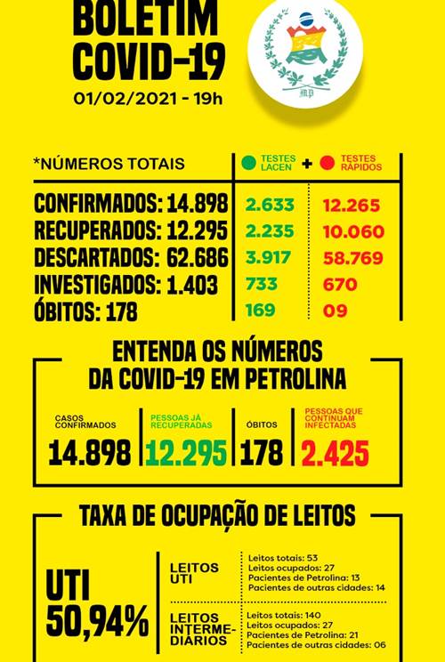 A taxa de ocupação geral dos leitos de UTI da rede é de 50,94%. Dos 53 leitos disponíveis, 27 estão ocupados, sendo 13 por pacientes de Petrolina e 14 por aqueles de outras cidades da região. Os dados completos podem ser acessados pelo link. Todas as informações sobre a pandemia na cidade também estão disponíveis no site da prefeitura.