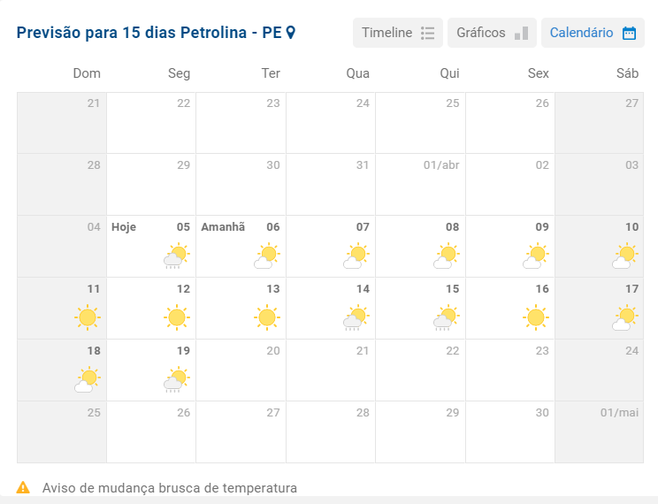 Durante a semana, a previsão é de sol com algumas nuvens e sem possibilidades de chuva, com máxima de 35°C e mínima de 22°C, e baixa umidade do ar.