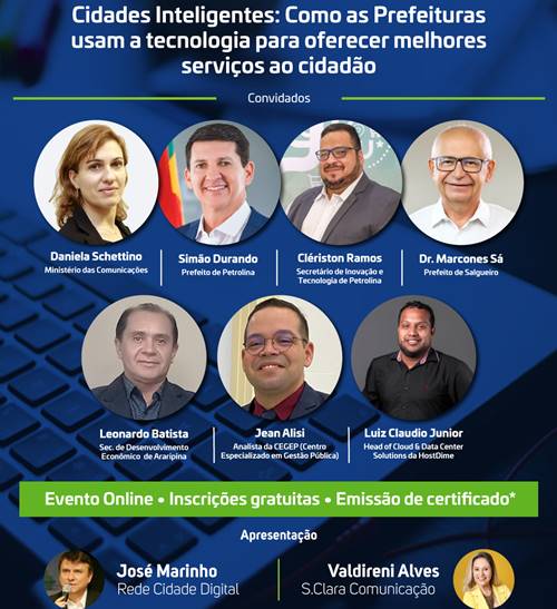 O diretor da RCD, José Marinho, explica que o objetivo do encontro virtual, apresentado pela jornalista Valdireni Alves, é compartilhar políticas públicas, modelos implantados nas Prefeituras e soluções disponíveis voltadas para tornar as cidades mais conectadas, eficientes e inteligentes. Entre os convidados confirmados estão os prefeitos de Petrolina, Simão Durando; de Salgueiro, Dr. Marcones Sá; e os secretários de Inovação e Tecnologia de Petrolina, Clériston Ramos, e de Desenvolvimento Econômico de Araripina, Leonardo Batista.