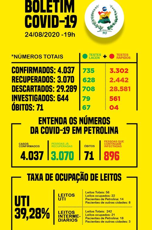 Foram 46 novos casos nesta segunda. Do total de confirmados até o momento, 3.302 foram por testes rápidos da prefeitura e 735 diagnosticados através de exames laboratoriais. Petrolina continua com 71 óbitos registrados.