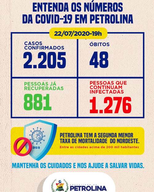 Petrolina contabilizou nesta quarta-feira (22), segundo boletim da Secretaria Municipal de Saúde (SMS), 2.205 casos confirmados do novo coronavírus (Covid-19). Foram realizados mais 371 testes rápidos, com 41 positivos. O município também recebeu 32 confirmações por meio de exames laboratoriais.