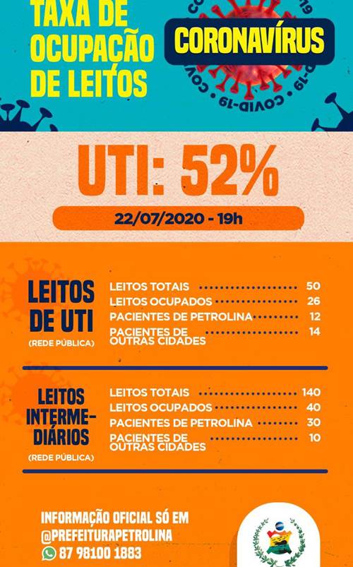A taxa de ocupação geral dos leitos de UTI da rede pública é de 52%. Dos 50 leitos disponíveis, 26 estão ocupados, sendo que 12 pacientes são de Petrolina e 14 de outras cidades da região. Os dados completos podem ser acessados no link.
