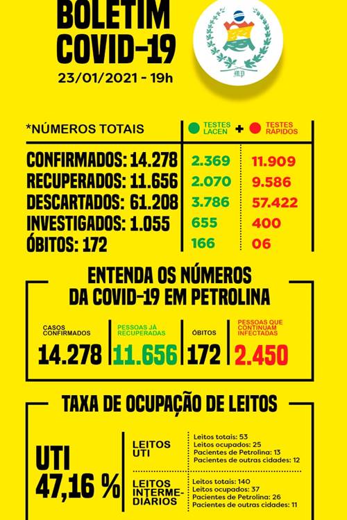 A taxa de ocupação geral dos leitos de UTI da rede é de 47,16%. Dos 53 leitos disponíveis, 25 estão ocupados, sendo 13 por pacientes de Petrolina e 12 por aqueles de outras cidades da região. Os dados completos seguem abaixo.