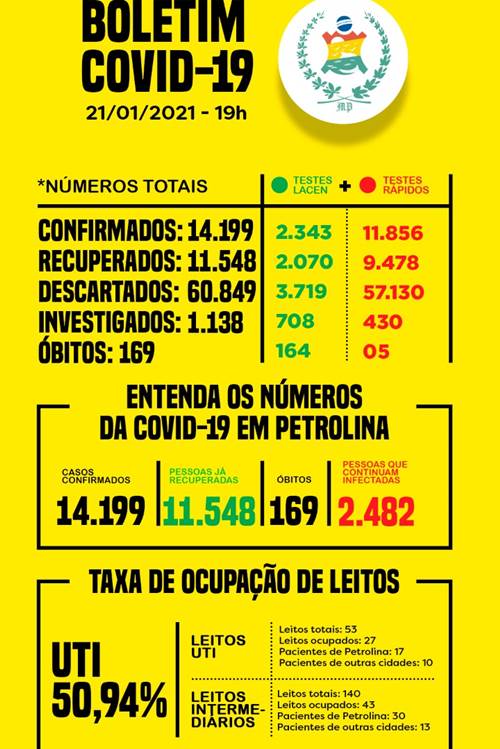 A taxa de ocupação geral dos leitos de UTI da rede é de 50,94%. Dos 53 leitos disponíveis, 27 estão ocupados, sendo 17 pacientes de Petrolina e 10 por aqueles de outras cidades da região. Os dados completos podem ser acessados pelo link. Todas as informações sobre a pandemia na cidade também estão disponíveis no site da prefeitura.