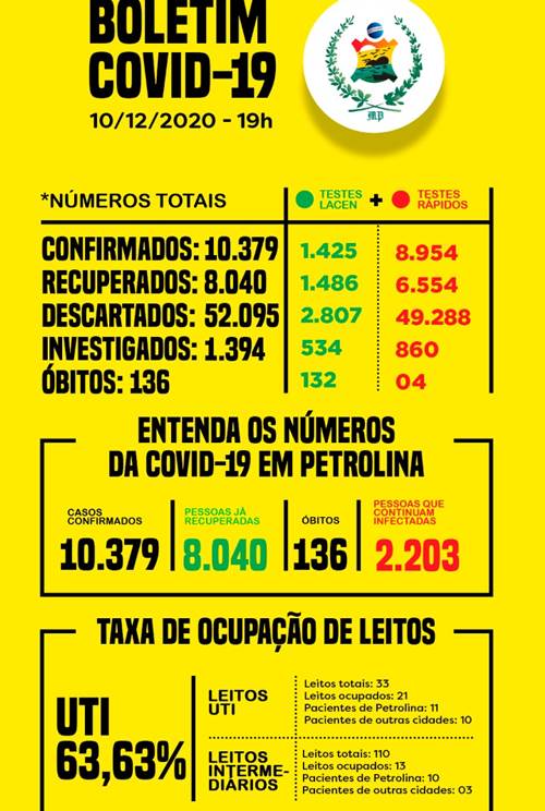 A taxa de ocupação geral dos leitos de UTI da rede pública permanece em 63,63%. Dos 33 leitos disponíveis, 21 estão ocupados – sendo 11 por pacientes de Petrolina e 10 por aqueles de outras cidades da região. Os dados completos podem ser acessados pelo link. Todas as informações sobre a pandemia na cidade também estão disponíveis no site da prefeitura.
