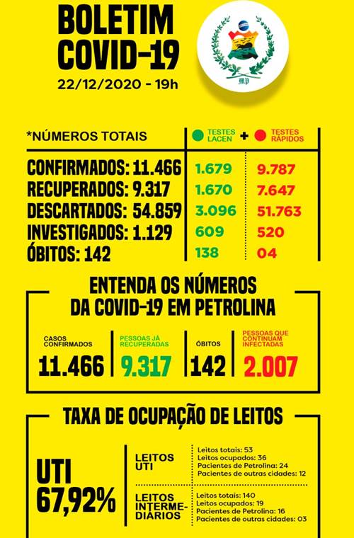 A taxa de ocupação geral dos leitos de UTI da rede é de 67,92%. Dos 53 leitos disponíveis, 36 estão ocupados, sendo 24 por pacientes de Petrolina e 12 por aqueles de outras cidades da região. Os dados completos seguem em anexo. Todas as informações sobre a pandemia na cidade também estão disponíveis no site da prefeitura.
