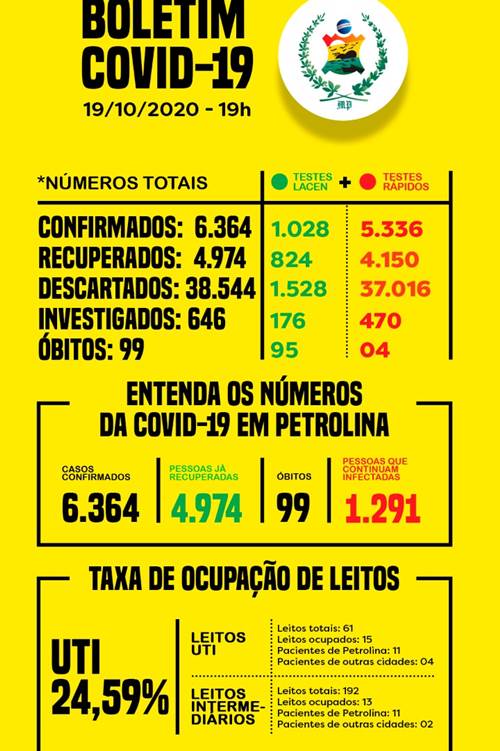 Do total de casos confirmados até o momento, 5.336 foram por testes da prefeitura, enquanto 1.028 foram diagnosticados através de exames laboratoriais. Petrolina manteve os 99 óbitos por Covid-19 até o momento.