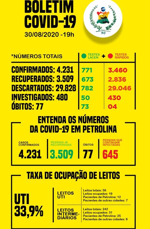 Dos 3.946 infectados, 2.151 são do sexo feminino e 1.795 do sexo masculino, sendo 246 profissionais de saúde. Em isolamento estão 1.582 pessoas e 15 internadas, sendo 9 em UTI e 6 em leitos intermediários. A lista completa dos casos internados na cidade em unidades da Rede PEBA (Pernambuco-Bahia) pode ser acessada pelo link.
