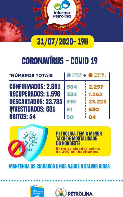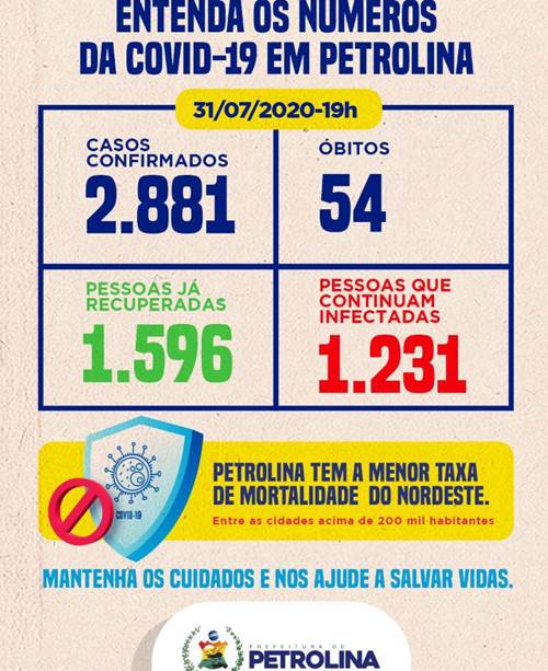 O mês de julho chega ao fim nesta sexta-feira (31) com 2.881 casos confirmados do novo coronavírus (Covid-19) em Petrolina, de acordo com o boletim atualizado da Secretaria Municipal de Saúde (SMS). Mais 351 pessoas foram testadas nesta sexta. Desse total, 75 positivaram para a doença. São 46 pessoas do sexo feminino com idades entre 4 e 88 anos, e 29 do sexo masculino, entre 3 meses de vida (um bebê) a 68 anos. Houve ainda 7 resultados confirmados de exames laboratoriais. Os pacientes são 4 do sexo masculino, entre 34 e 44 anos, e 3 do sexo feminino, entre 9 e 60 anos – totalizando 82 casos registrados da doença no dia de hoje .