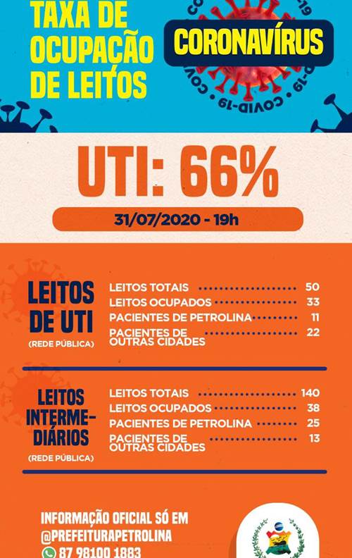 A taxa de ocupação geral dos leitos de UTI da rede pública é de 66%. Dos 50 leitos disponíveis, 33 estão ocupados, sendo 11 por pacientes de Petrolina e 22 de outras cidades da região. Os dados completos podem ser acessados pelo link.