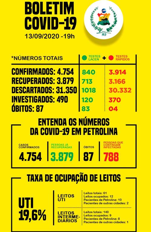 O boletim epidemiológico da Prefeitura de Petrolina deste domingo (13) aponta que o município segue com 4.754 casos confirmados do novo coronavírus (Covid-19). Do total de confirmações até o momento, 3.914 foram por testes rápidos da prefeitura e 840 diagnosticados através de exames laboratoriais.