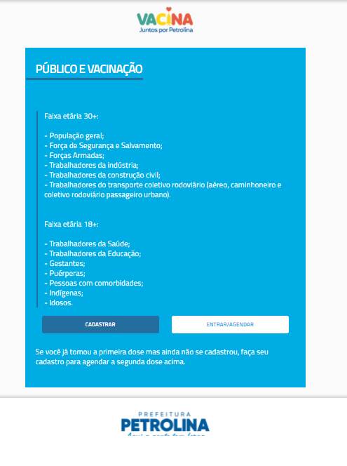 Após os recentes transtornos causados por problemas no agendamento para a vacinação contra a Covid-19, a Prefeitura de Petrolina lançou nesta quarta-feira (4) a nova plataforma para receber o imunizante. O novo site tem maior capacidade para suportar a quantidade de acessos simultâneos, além de apresentar maior agilidade nas informações que serão repassadas em tempo real para o Ministério da Saúde. A troca de sistema foi necessária após a plataforma anterior apresentar diversos problemas.